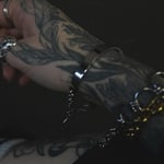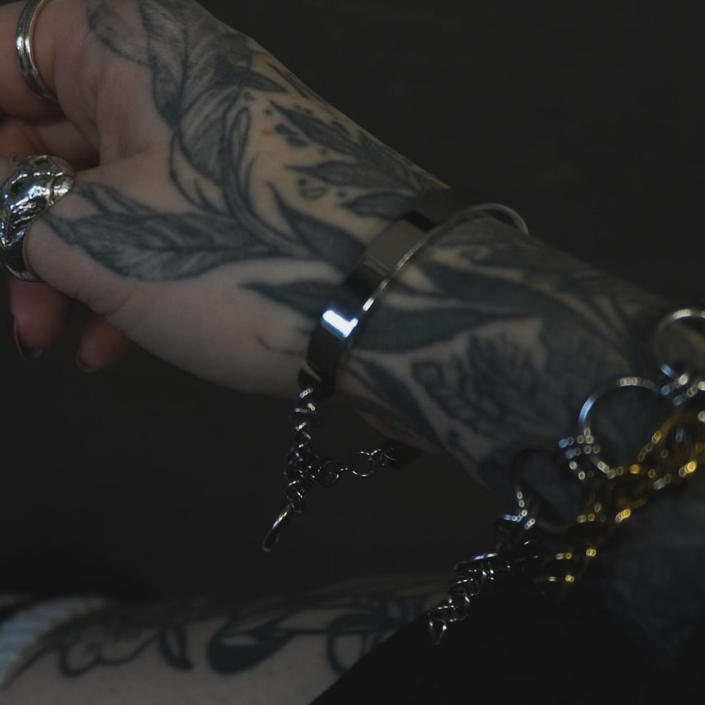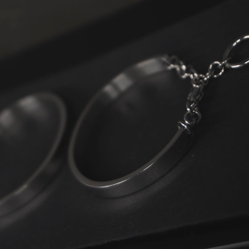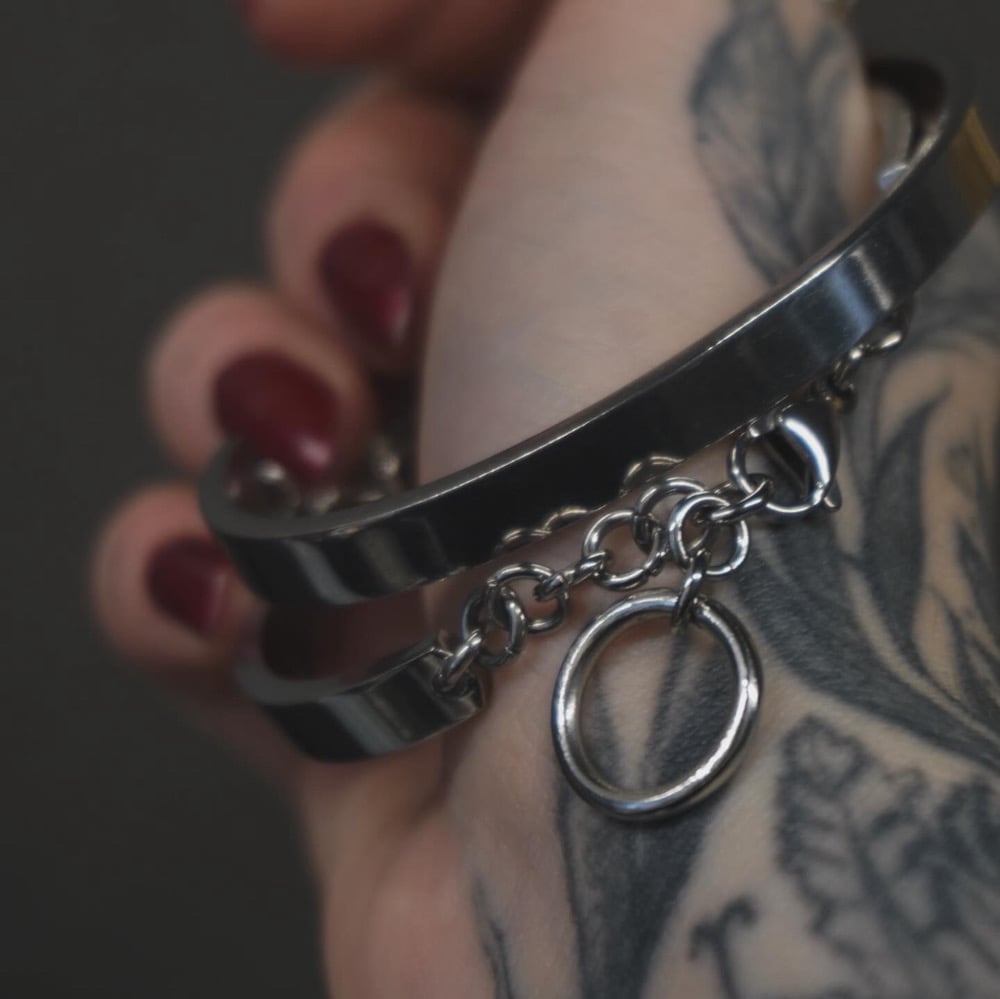 Solid but comfortable, this bracelet is made using a stainless steel bar to create a half cuff bracelet, connected with a thin stainless steel chain and lobster clasp, with an added stainless O ring.