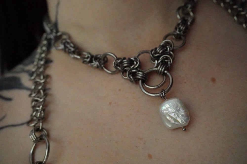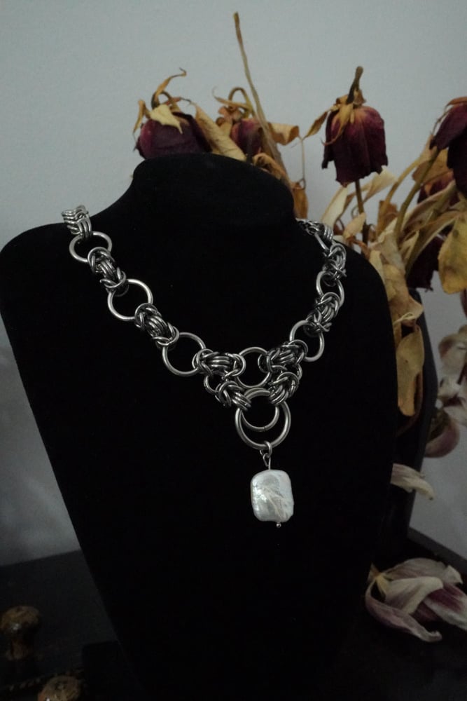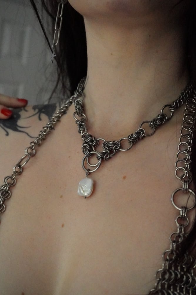 Featuring a multitude of different chainmail weaves, ring sizes and a gorgeous baroque pearl front and centre, the Fi choker is a gorgeous combination of that gothic chainmail look with a touch of elegance.