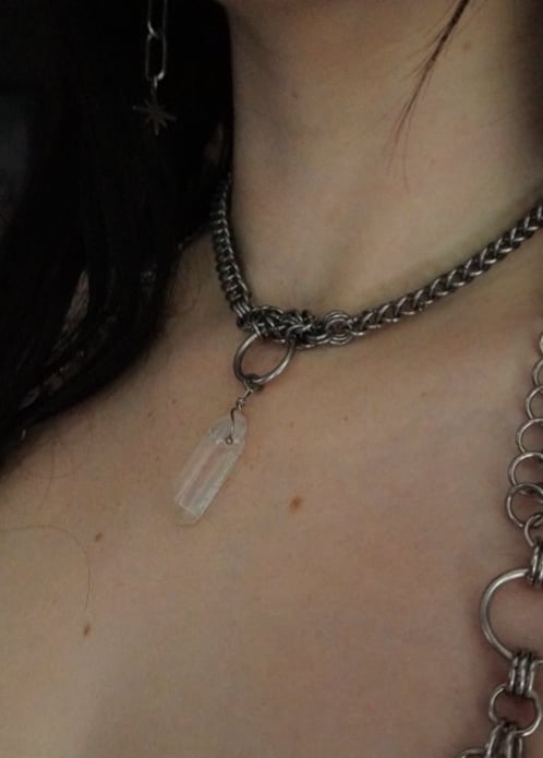 Another crystal addition to the newest black hearts collection, this necklace is made with a central O ring weaved into what is usually the ‘Saint’ chain with a Persian chainmail weave to finish off the piece.