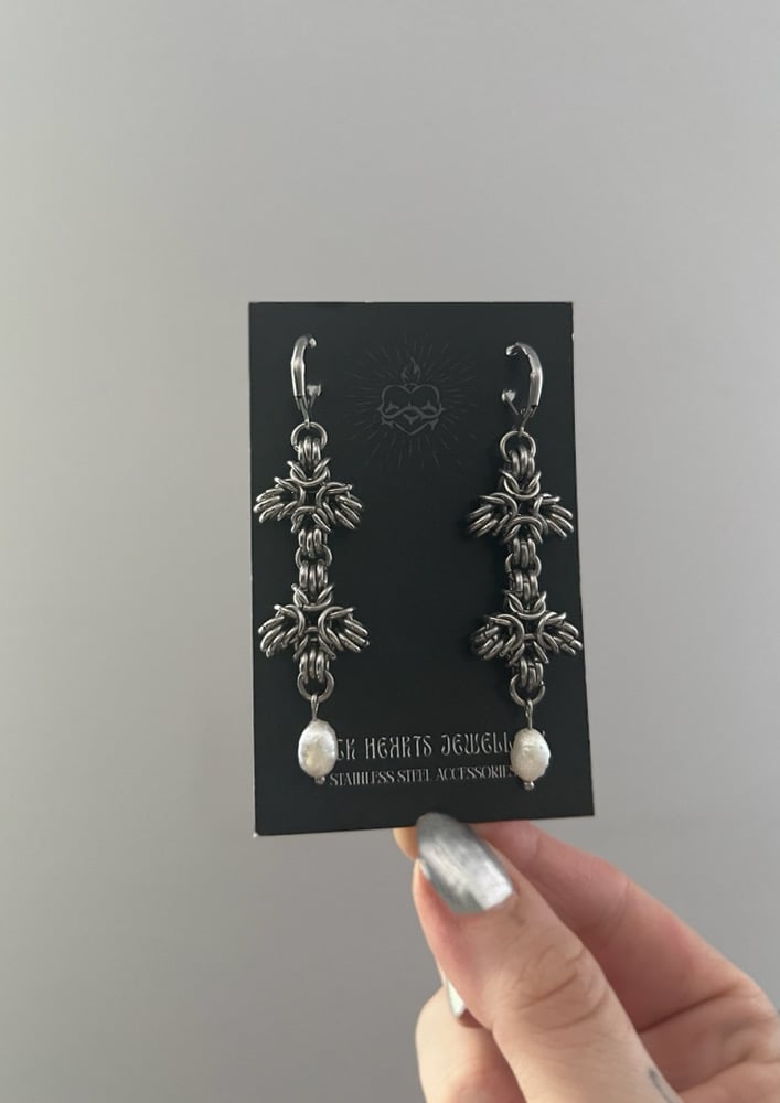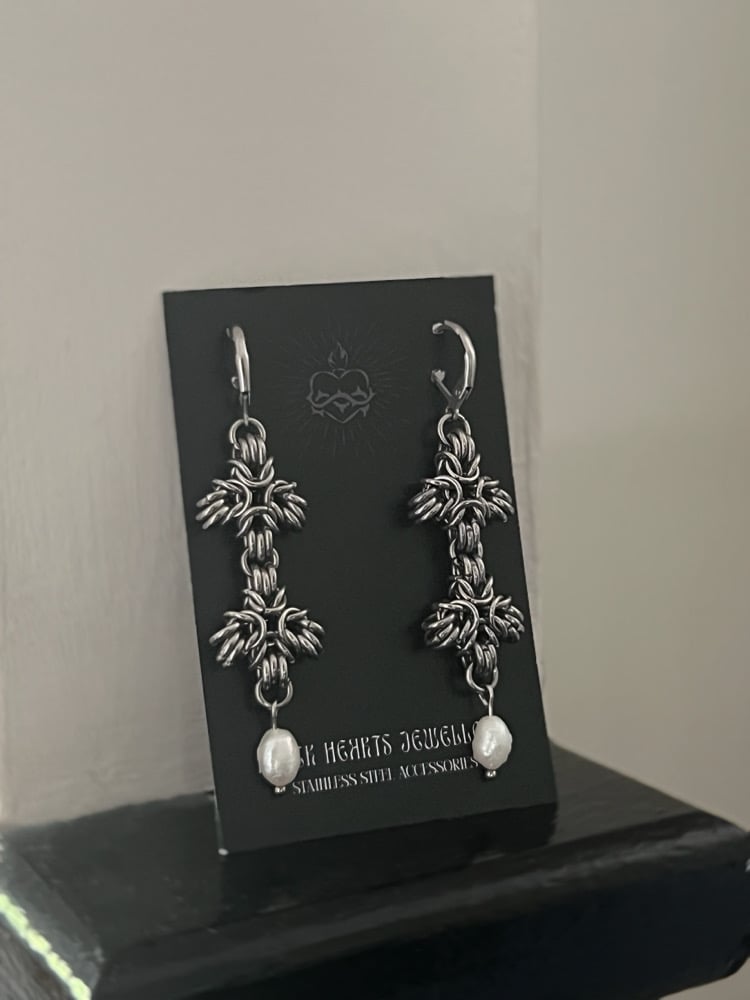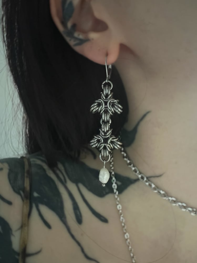 These are made with stainless steel jump rings and hand weaved to create a unique piece, held on a teardrop shaped huggie hoop with lever back fastening.