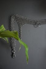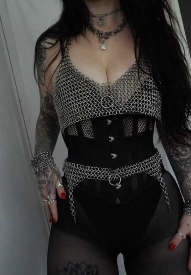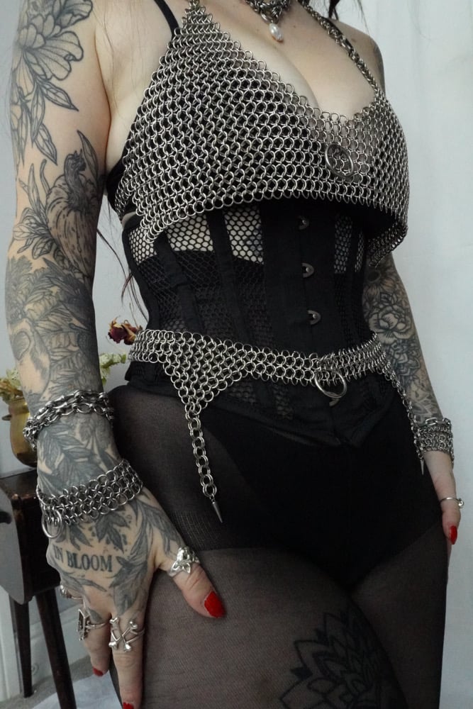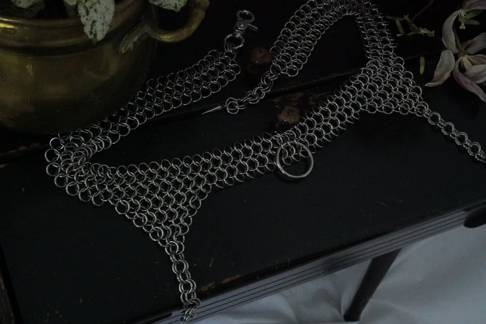 Adorned with small steel spikes on the extension chain at the back as well as the garter look drop at the front paired with a large central O ring this piece is a real eye catcher.